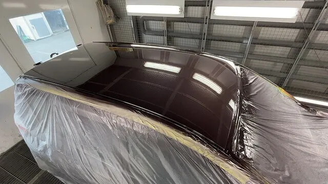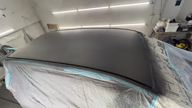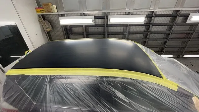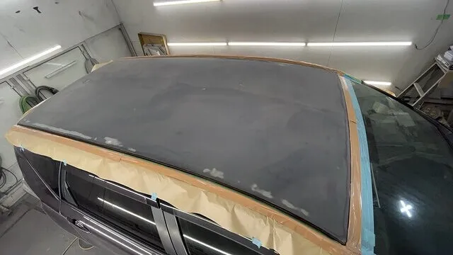 傷がついてはいけない部分を養生(マスキング)をしてルーフ、フード、リヤスポイラーを機械を使ってサンドペーパーで削って平滑にした画像です。