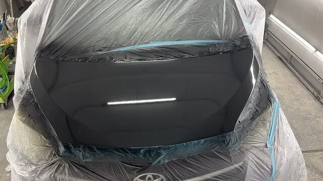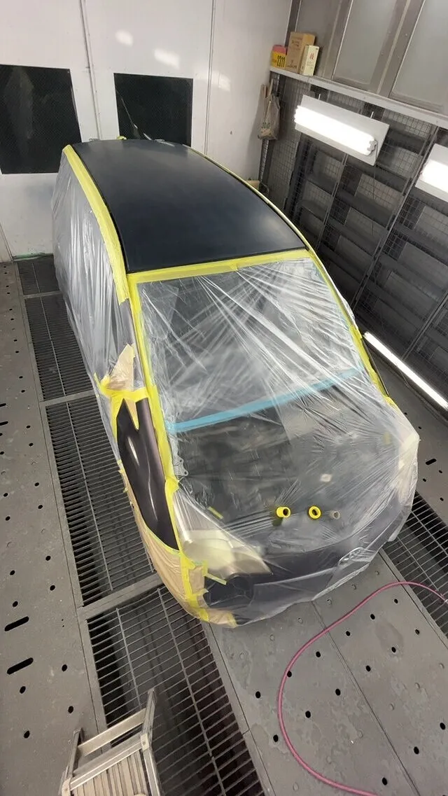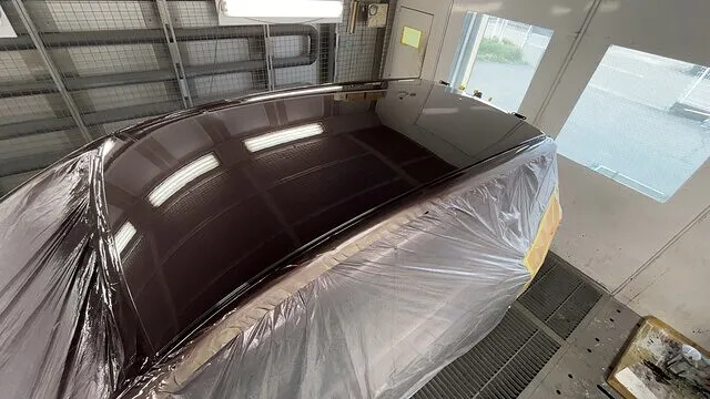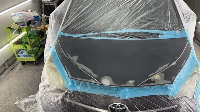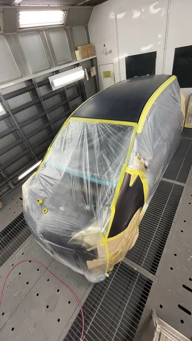塗装ブースにて塗装前の養生を終えた画像です。